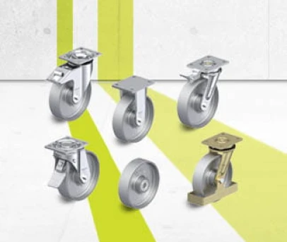 Blickle cast iron wheels are made from robust grey cast iron with a hardness of 180 to 220 HB. They are extremely wear-resistant and provide very little rolling and swivel resistance. Cast iron wheels are self-lubricating due to the graphite which they contain. However, they should always be sufficiently lubricated using the grease nipple, particularly when using the plain bore version. Due to the relatively high level of floor pressure, care must be taken when using this wheel series on sensitive surfaces. The silver coating on the wheels can change colour at high temperatures, but this does not affect the corrosion protection provided by the coating. Standard cast iron wheels are designed for use in temperatures of up to 120°C. A heat-resistant version with a plain bore is available for use in higher temperatures of up to 600°C. These are typically used for applications which require a high level of heat resistance and in powder-coating facilities due to their resistance to oil and chipping.