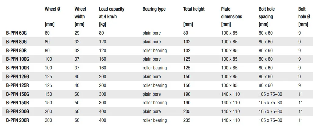 The PPN wheel series is available with a variety of brackets with a plate fitting as part of the standard range. These vary in terms of their design: